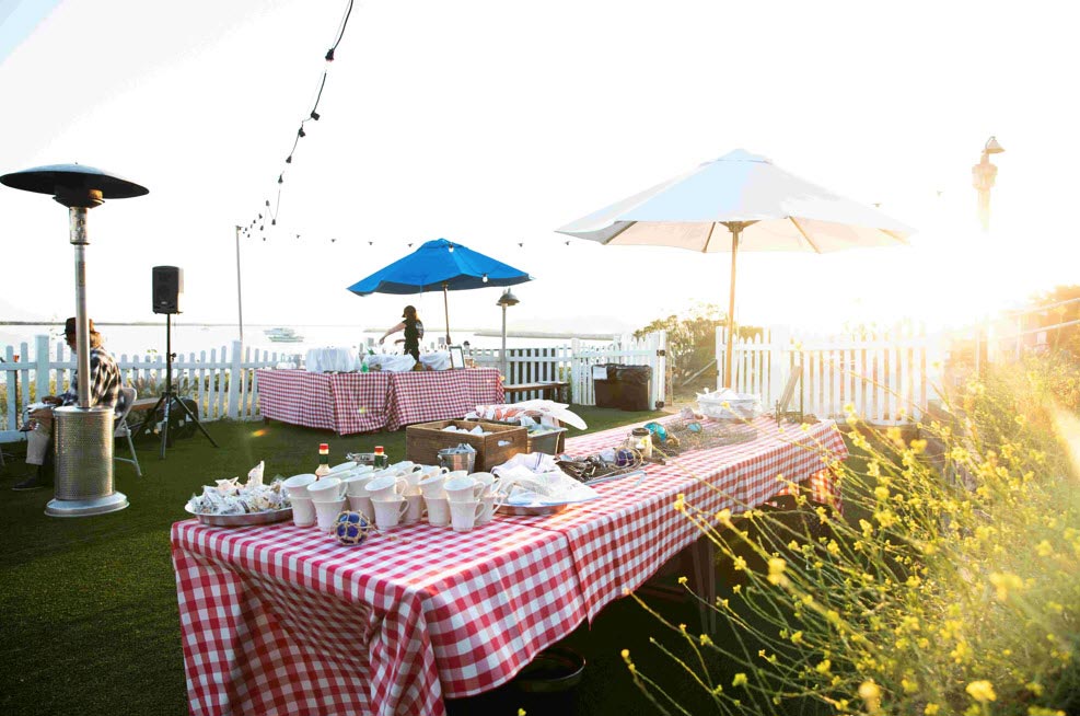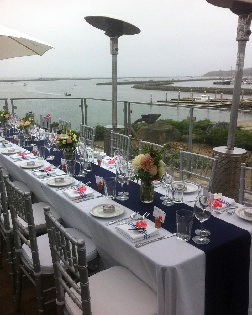 The North Patio directly overlooks the ocean with a view of the harbor and is a great location for an outdoor lunch or dinner. The patio can be optionally tented for more weather protection, and is a great location for a business meal, bridal shower, family dinner, or other special events.