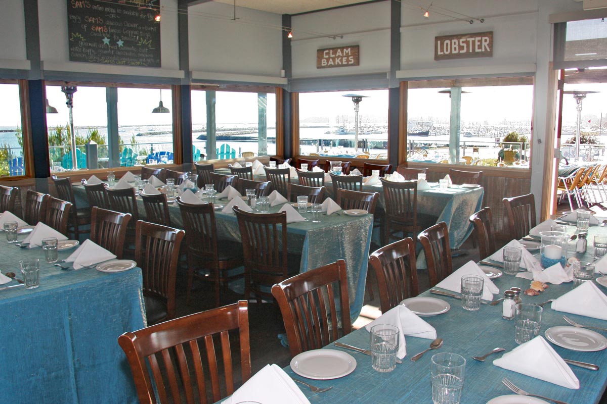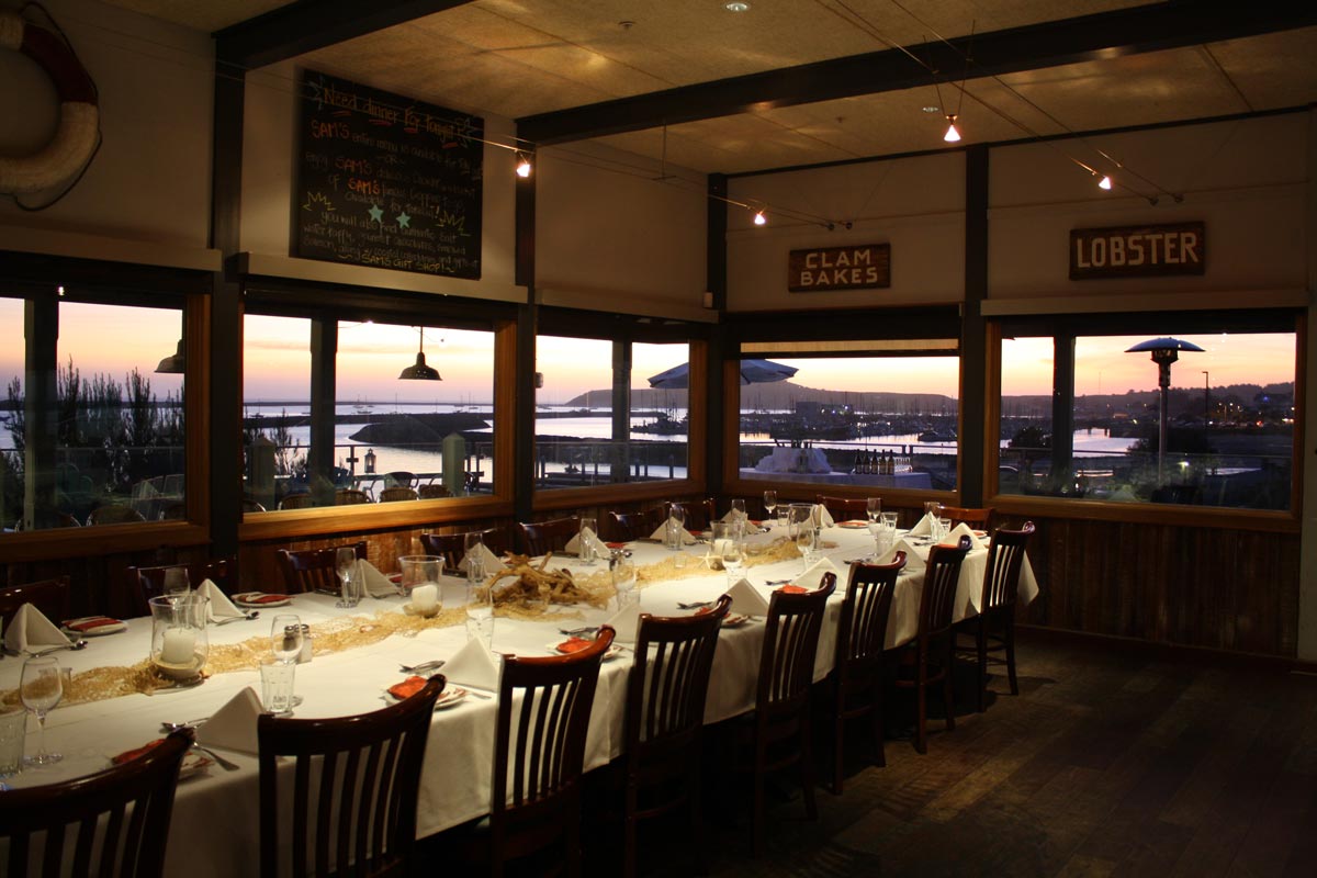 Sam’s specializes in private dining, from fun family reunions to corporate events and offsites. Our excellent private dining staff, award-winning seafood, and spectacular oceanfront setting will give your guests an unforgettable experience. Sam’s is the perfect coastal gathering place, with multiple unique indoor and outdoor event spaces, various private event menu options, outdoor heat lamps and wind breaks, stunning views and spectacular sunsets.